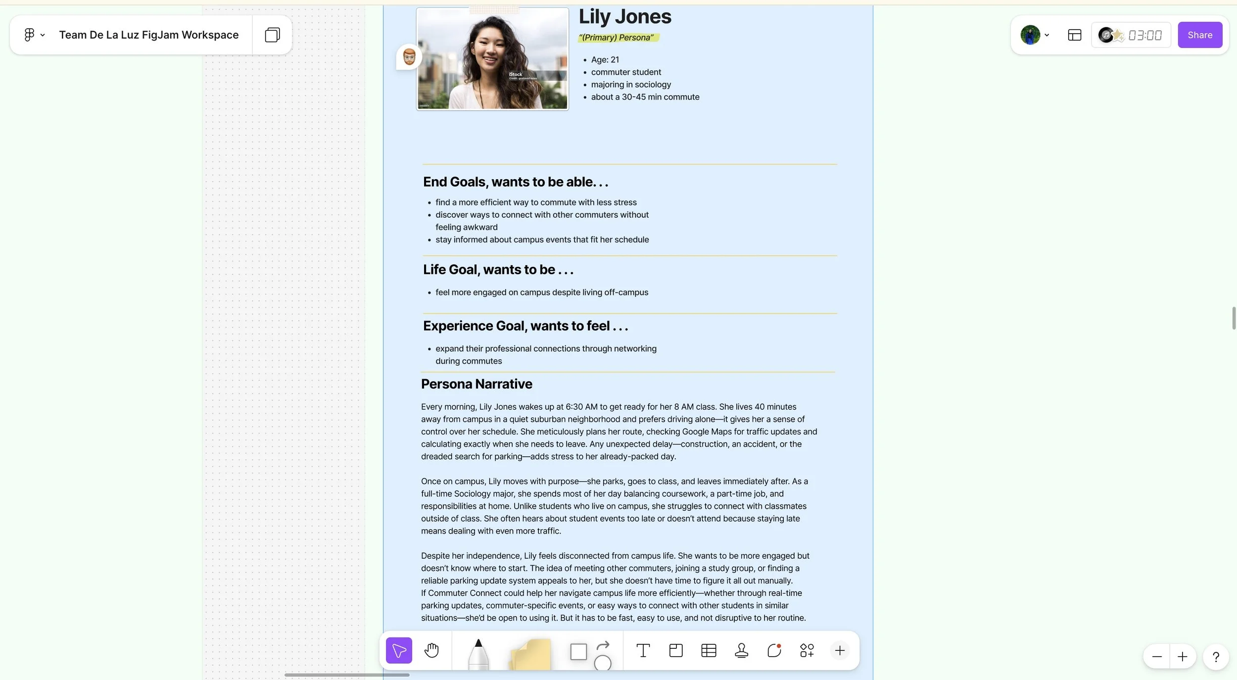 Based on our findings when talking to our interviewee’s we created our primary persona, Lily Jones, a 21 year-old commuter who wants to maximize her limited time on campus while staying connected to events.”