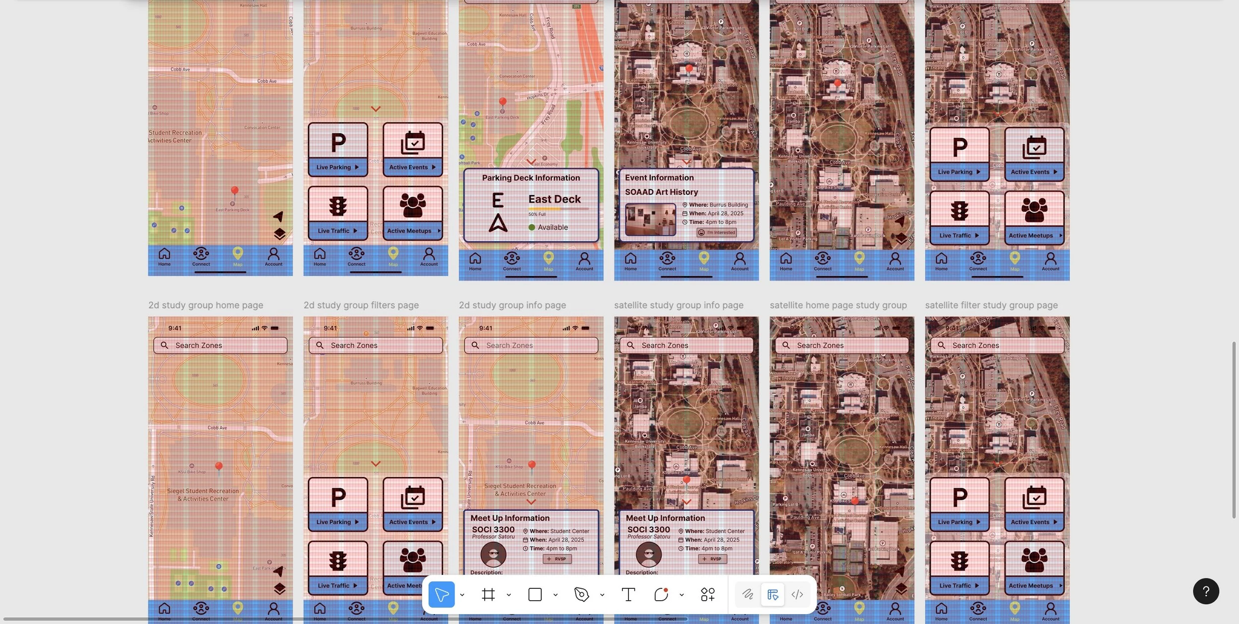 Our low-fidelity wireframes focused on mapping the core structure of the app before visual design. Each screen explored how commuters could quickly access parking information, browse campus events, and connect with peers — all within two to three taps.