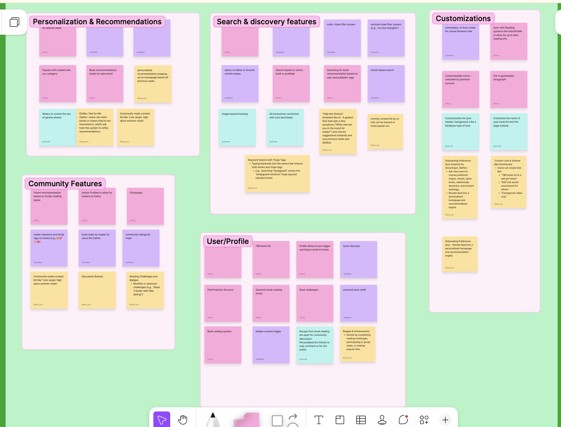 During our User Interviews, we created affinity maps for each person and we identified that all our interviews agreed on customizations for our app as well as some discovery features we could add. They all had some sort of history with GoodReads