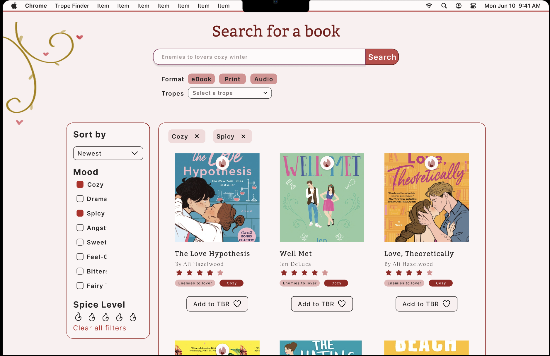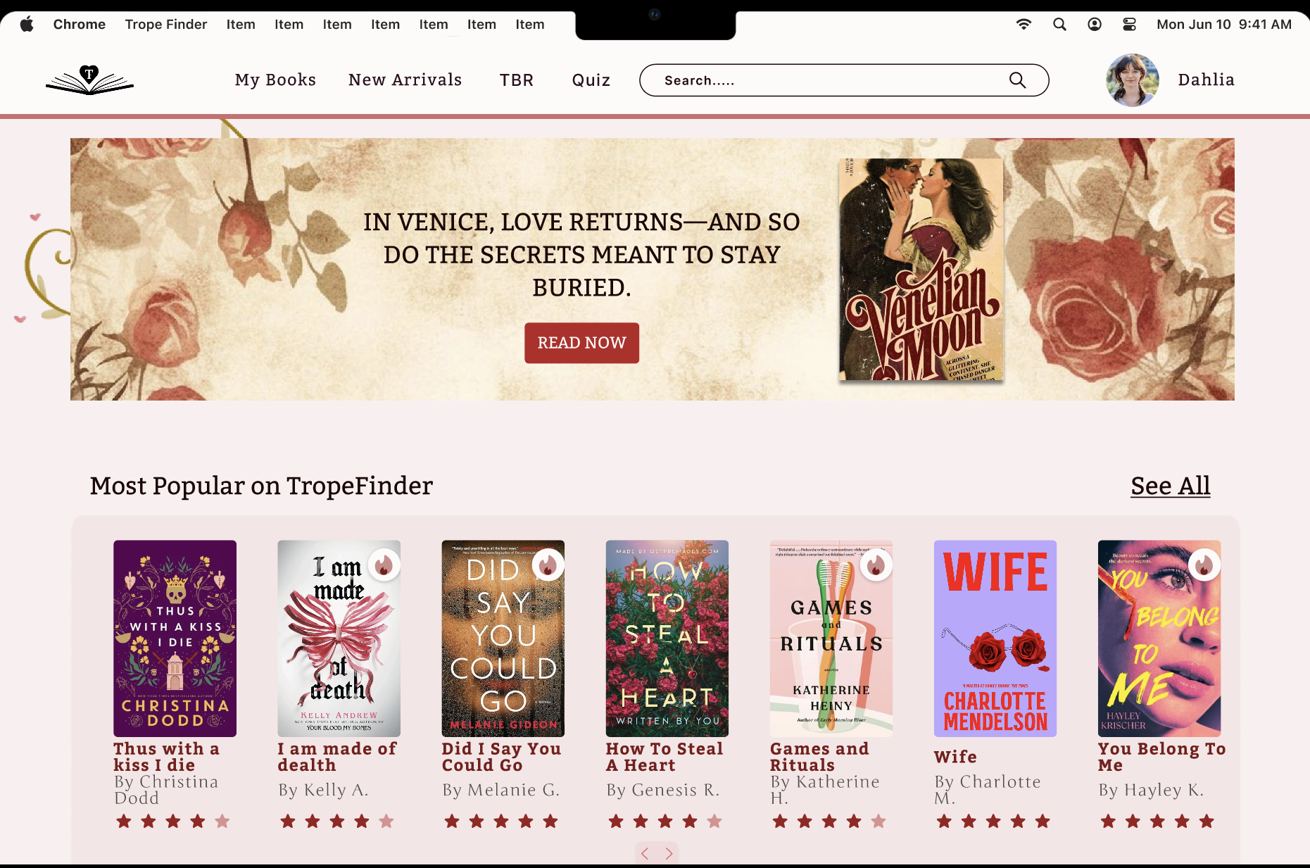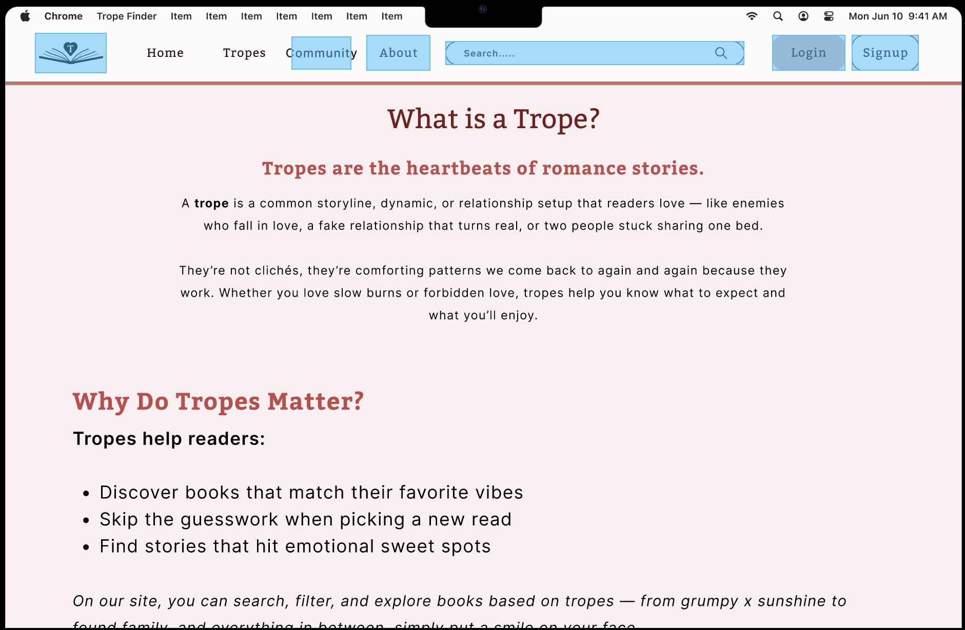 TropeFinder is a web-based platform that allows readers to discover, explore, and filter books based on story tropes, themes, and emotional tones. The project aimed to simplify the book discovery experience by focusing on how readers emotionally connect with stories rather than just by genre or author.