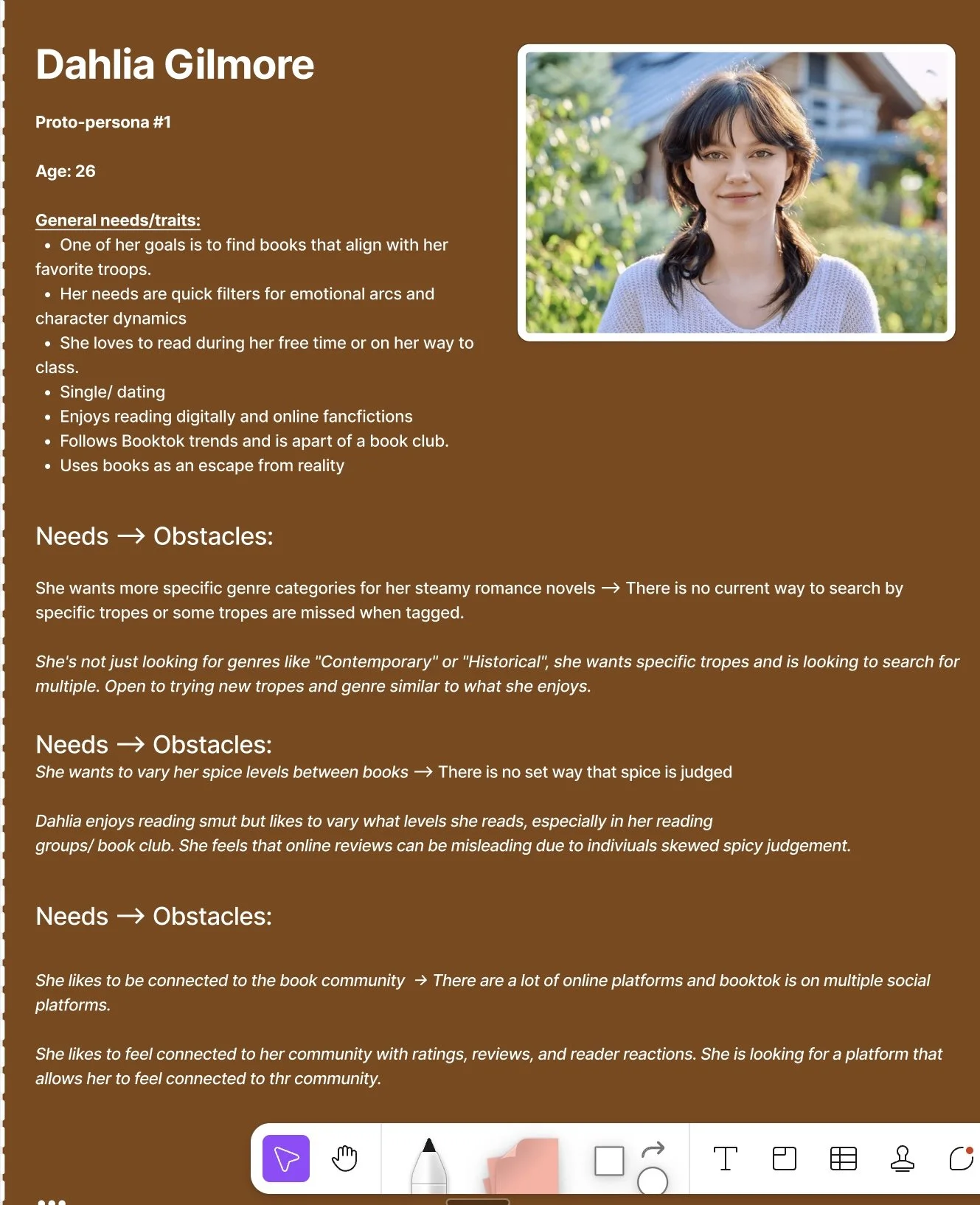 Dahlia Gilmore is the persona my team and I created. She is a 26-year-old avid reader who values discovering new stories through shared emotional experiences. They often feel overwhelmed by recommendation engines that lack personal connection and context.