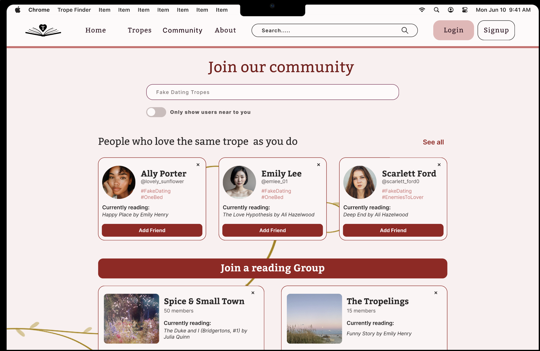 Through collaborative FigJam sessions, we brainstormed core interactions such as trope-based filtering, mood-driven searches, and visual trope maps. We created our MVP table to identify what must be built first, what can wait later for iterations, and what should be tested with users. Once we got this out of the way, we had very limited time with wire-framing so we went straight into our Figma design.The design goal was to help readers intuitively connect themes across different genres.